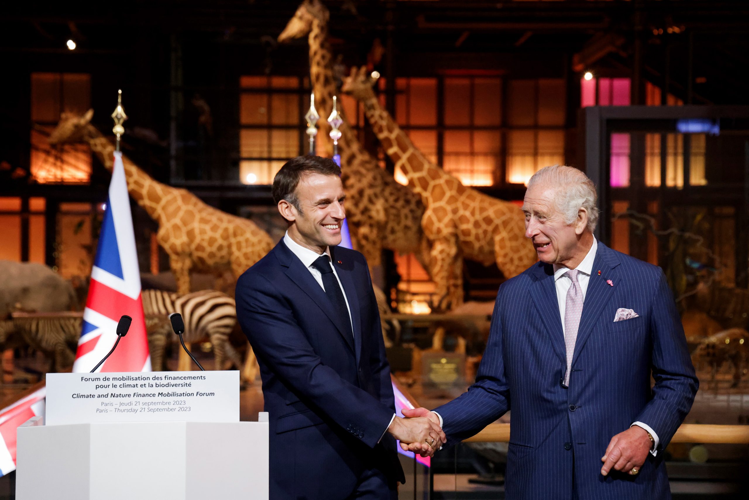El rey y Macron acudieron posteriormente al Museo de Historia Natural, donde clausuraron un foro empresarial franco-británico de lucha contra el cambio climático.