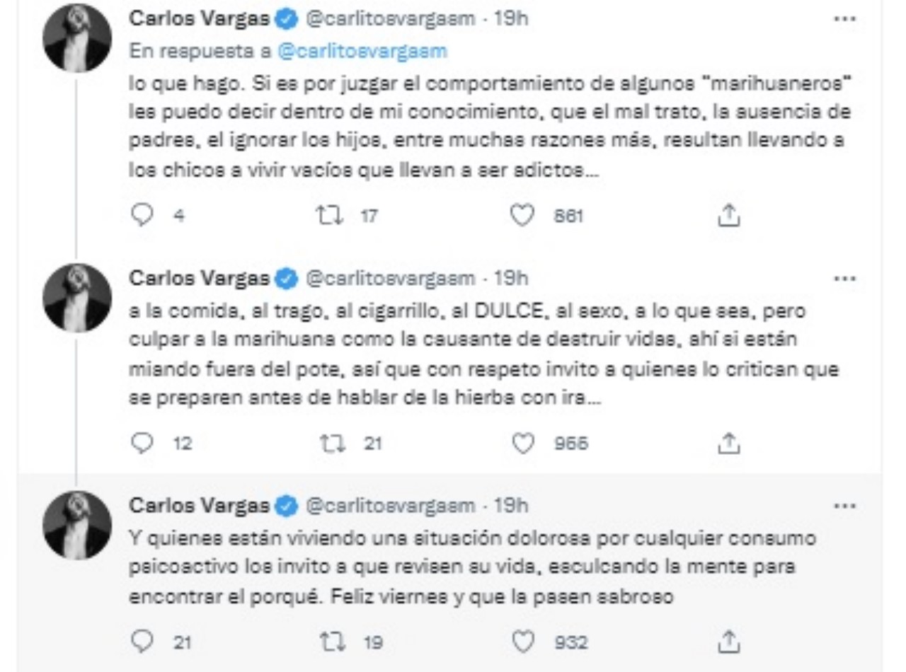 El presentador Carlos Vargas habló de su experiencia con la marihuana, por medio de su cuenta de Twitter afirmó que aunque consume “Nunca le he faltado al respeto a nadie”.