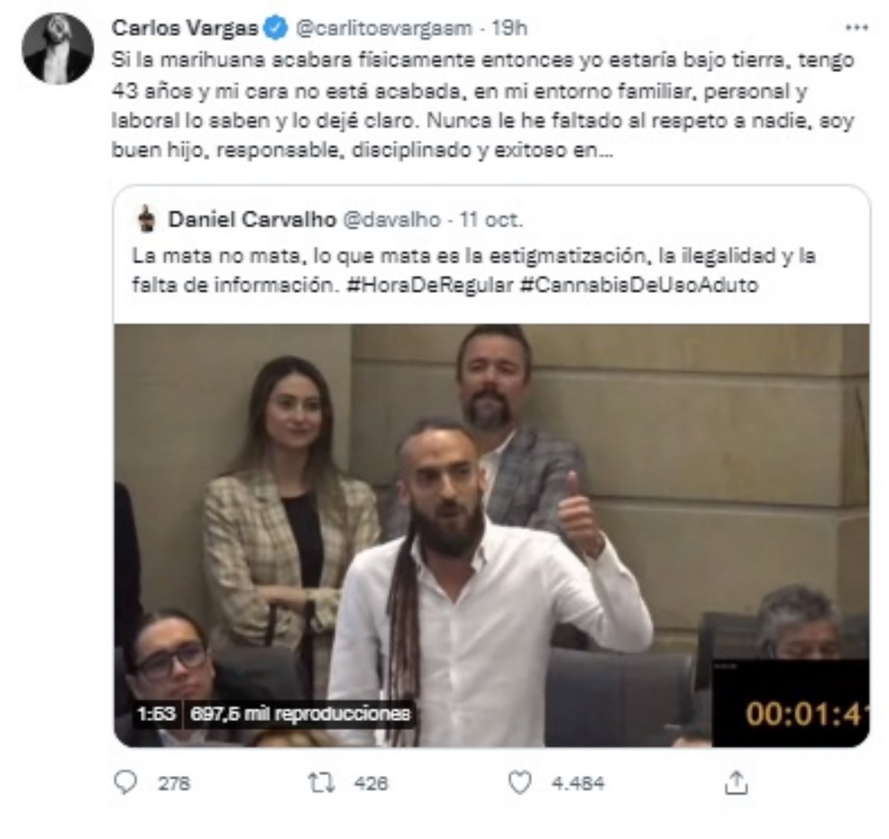 “Si la marihuana acabara físicamente entonces yo estaría bajo tierra, tengo 43 años y mi cara no está acabada, en mi entorno familiar, personal y laboral lo saben y lo dejé claro. Nunca le he faltado al respeto a nadie, soy buen hijo, responsable, disciplinado y exitoso en…”, escribió el presentador citando el tuit de Daniel Carvalho, representante a la Cámara por Antioquia, quien contó que fuma marihuana desde hace 25 años.
