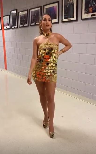 Con sus otros looks se dejó ver con vestidos más cortos, por ejemplo, usó un vestido azul con cadenas y otro, con detalles dorados.