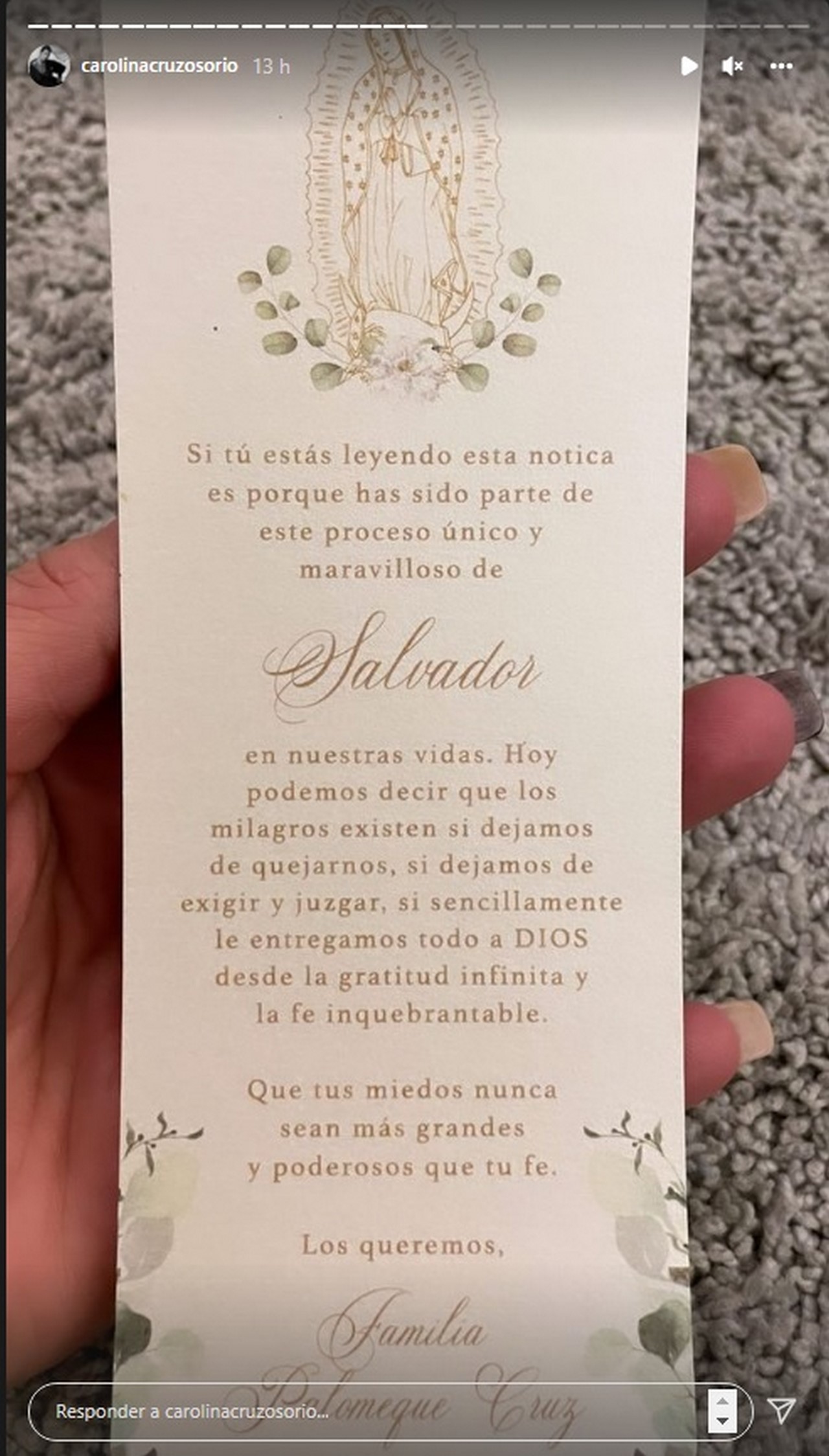 “Hoy podemos decir que los milagros existen si dejamos de quejarnos, si dejamos de exigir y juzgar, si sencillamente le entregamos todo a Dios desde la gratitud infinita y la fe inquebrantable”, decía la tarjeta de bautizo.