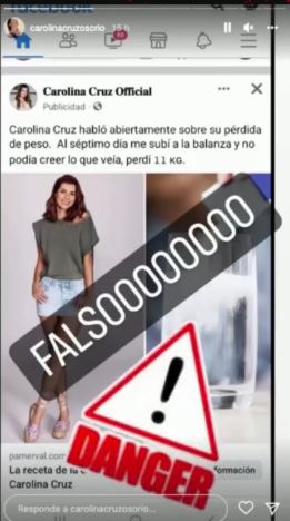 Carolina Cruz se unió a la extensa lista de famosos colombianos que son utilizados para estafar en redes sociales. Los ladrones cibernéticos crearon una cuenta falsa de Facebook de la presentadora de televisión para promocionar un producto adelgazante, y en la descripción brindan supuestos detalles de su peso y estatura.