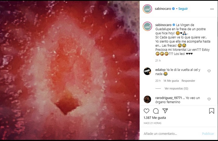 A través de su cuenta de Instagram, Carolina publicó una foto en la que salía media fresa en la que se ve una silueta blanca, según Carolina Sabino, se trataría de la imagen de la Virgen de Guadalupe.