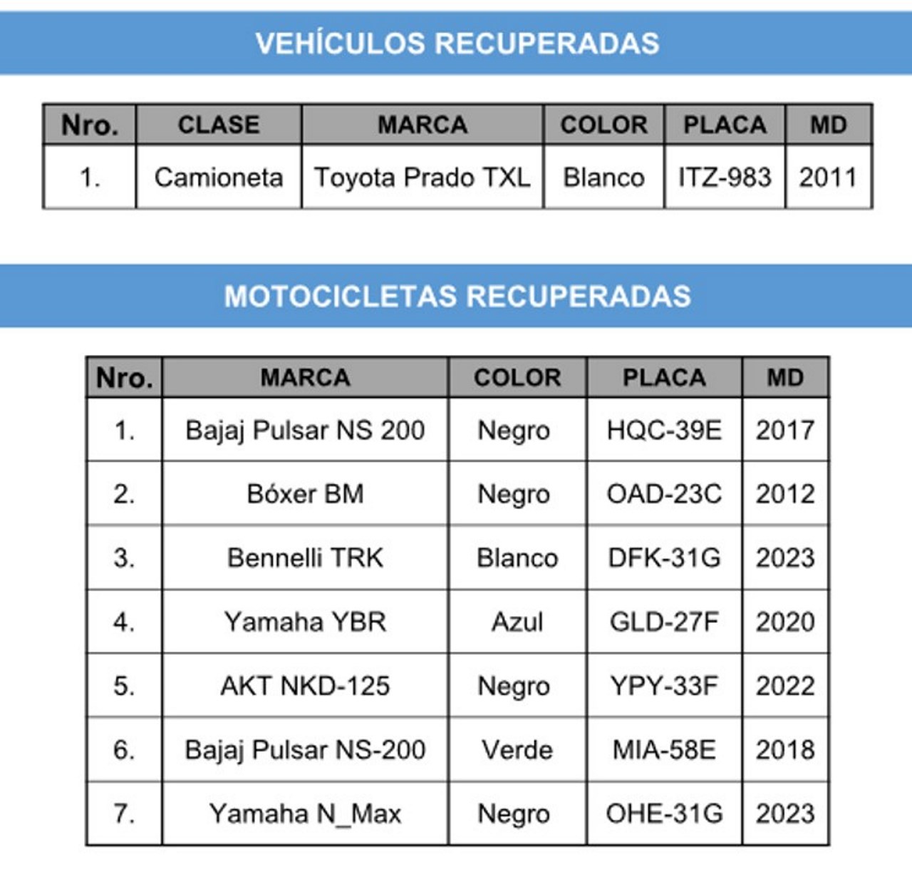 Entre los vehículos, reportados por hurto, se encuentran dos motos modelo 2023 y el carro es una camioneta TXL modelo 2011.