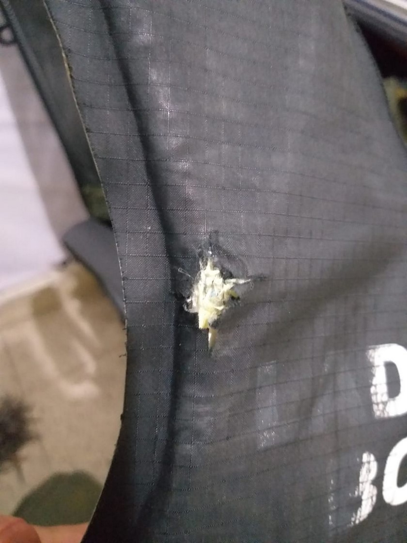 El Departamento de Policía de Antioquia compartió las fotografías en las que se puede observar cómo quedó el chaleco del patrullero de la Policía que fue atacado a disparos por un ciudadano en el municipio de San Rafael, Antioquia.
