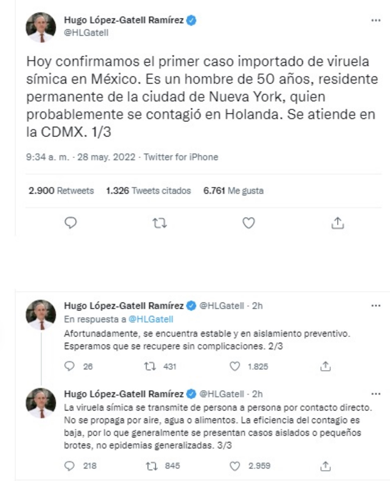 A través de su cuenta de Twitter informó: “Hoy confirmamos el primer caso importado de viruela símica en México. Es un hombre de 50 años, residente permanente de la ciudad de Nueva York, quien probablemente se contagió en Holanda. Se atiende en la CDMX”.