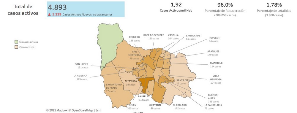 Este 5 de abril de 2021 informaron que se presentaron 1339 nuevos casos, además reportaron que hay 217.834 casos positivos de Covid-19 en el municipio de Medellín. Tal y como detalló en la cuenta de Twitter, se han recuperado 209.053 personas, 4.893 casos se mantiene activos y han fallecido al menos 3.888 personas por Covid-19.