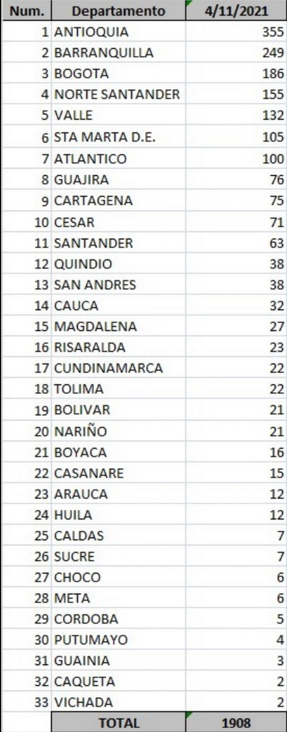 11.863 casos activoshttps://t.co/SiKTpTCQ3W pic.twitter.com/TmzArvQOf8— MinSaludCol (@MinSaludCol) November 4, 2021