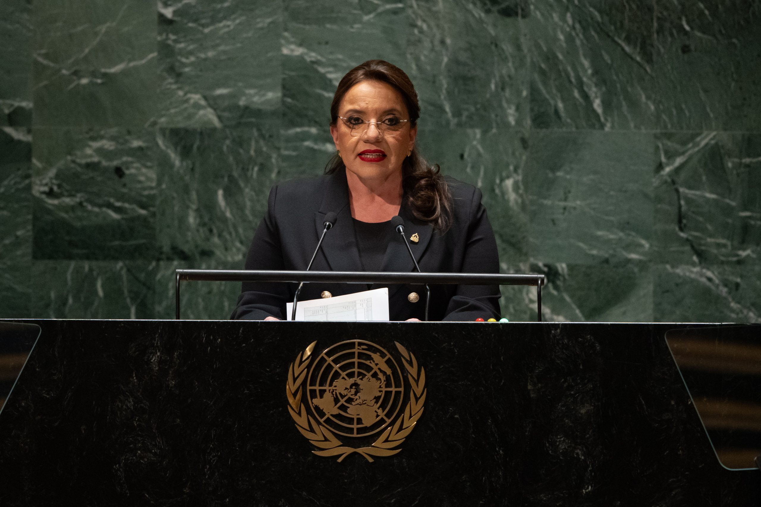 Además, "condena al sacrificio a un noble pueblo que, a pesar de las limitaciones que se le imponen, continúa aportando al mundo acciones solidarias", señaló la presidenta hondureña, al condenar "el largo bloqueo contra Cuba y Venezuela".