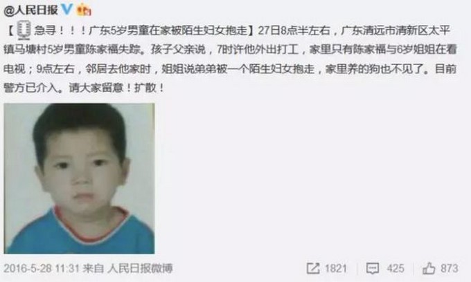 El niño había sido secuestrado en su casa en Matang Village, Qingyuan, el 27 de mayo de 2016.