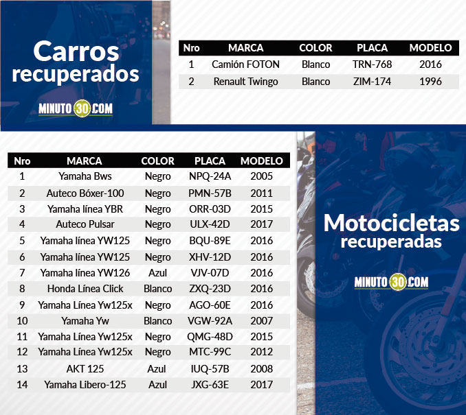 Catorce motos y dos carros fueron recuperados por la policía. Placas