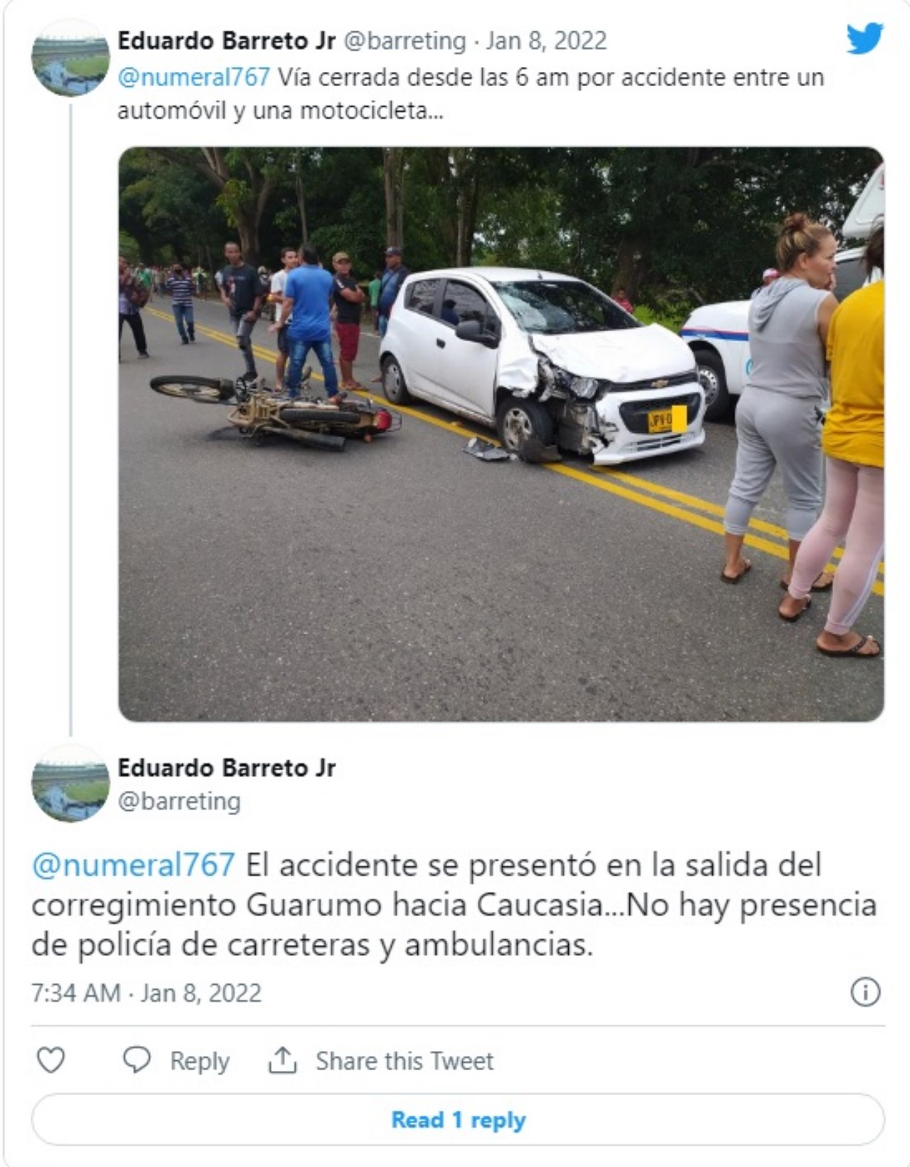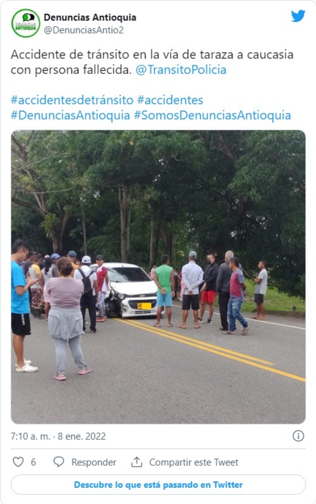A través de redes sociales publicaron una fotografía con la que evidencian el accidente, donde se ve un carro de color blanco afectado en el lado del copiloto. Al parecer, la multitud de la gente no dejaría ver la víctima mortal.