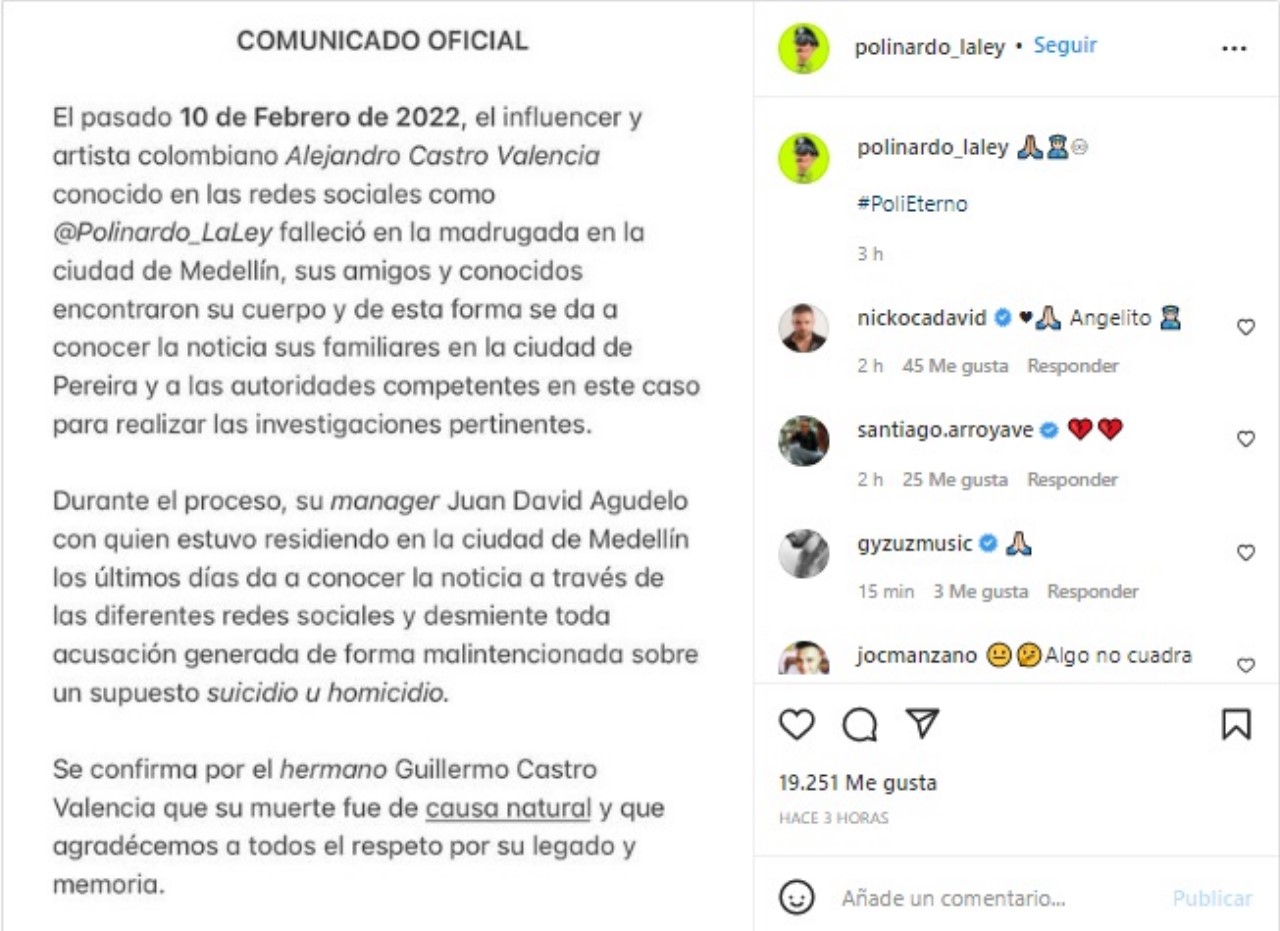 Hace poco a través de la cuenta de Instagram de Polinardo La Ley se conoció un comunicado donde detallaban que “su causa de muerte fue de causa natural”