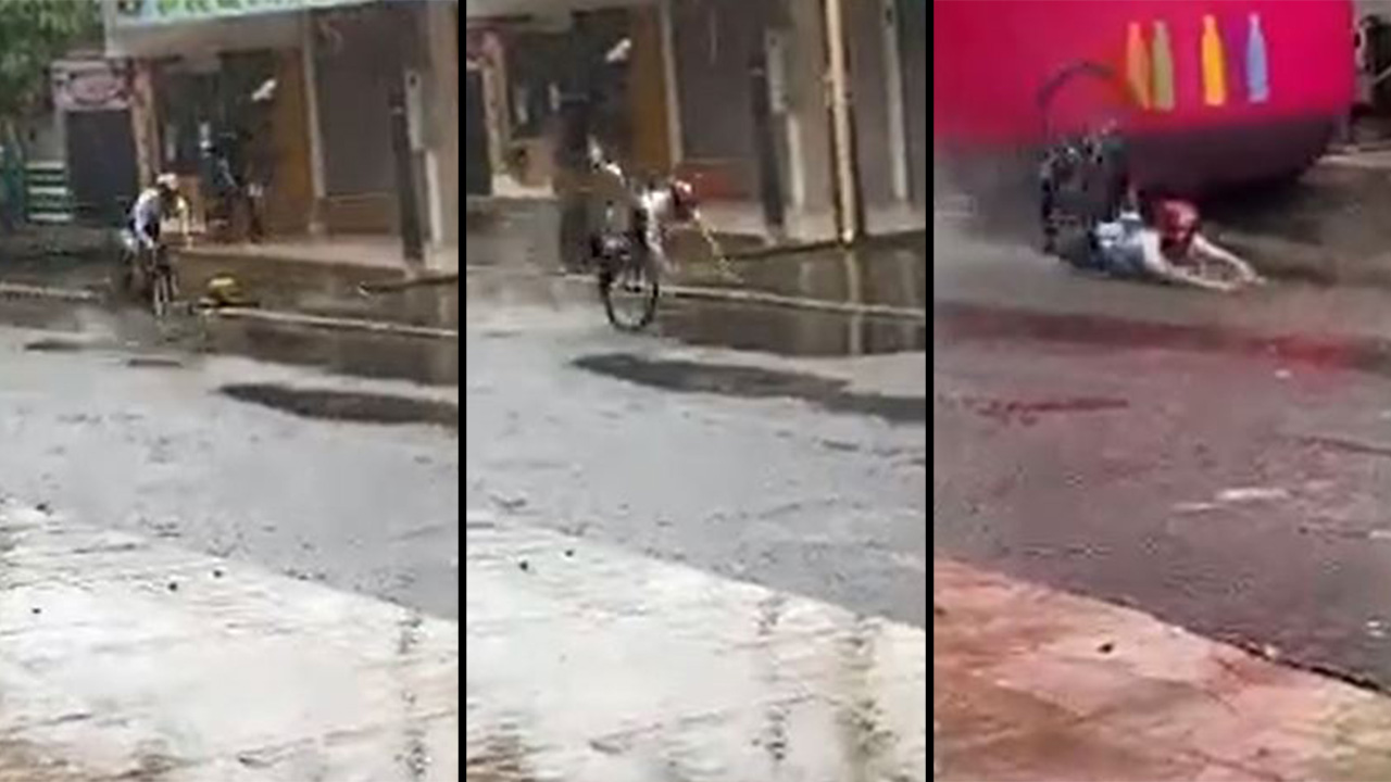 Un video grabado por un aficionado que veía la competencia captó el dramático instante en el que uno de los competidores cae a un hueco de la calle y sale disparado de su ‘caballito de acero’.