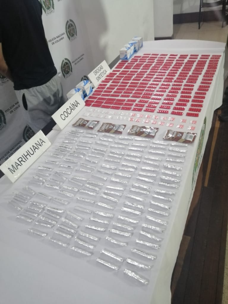 En total le encontraron casi dos mil pastillas de droga sintética, 150 cigarrillos de marihuana, 30 bolsas de base de coca.
