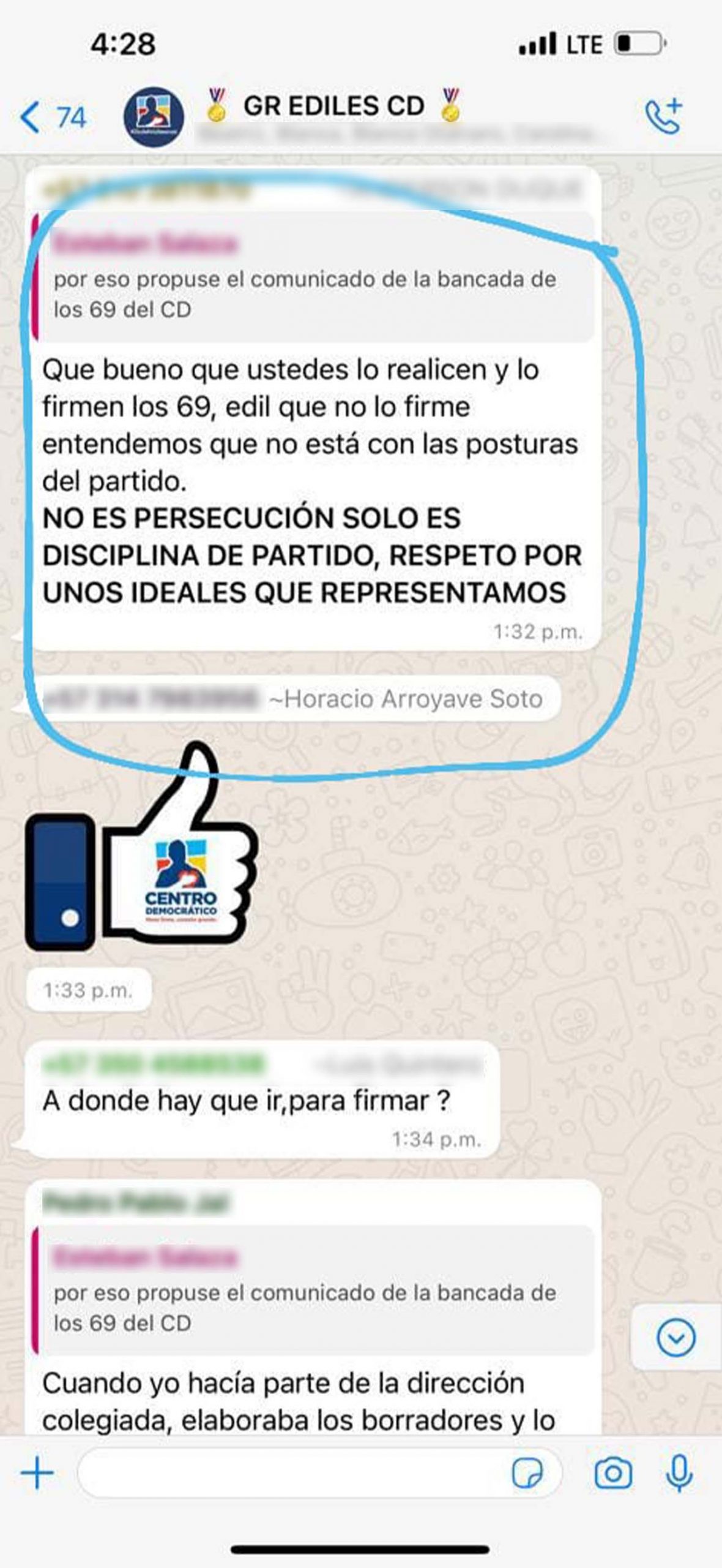 Incluso, se puede evidenciar en un chat grupal donde aparecen los ediles que tiene el Centro Democrático en Medellín, y allí quedó reflejado como al interior del partido estarían indagando por los 30 ediles de este partido que respaldaron al Alcalde de Medellín.