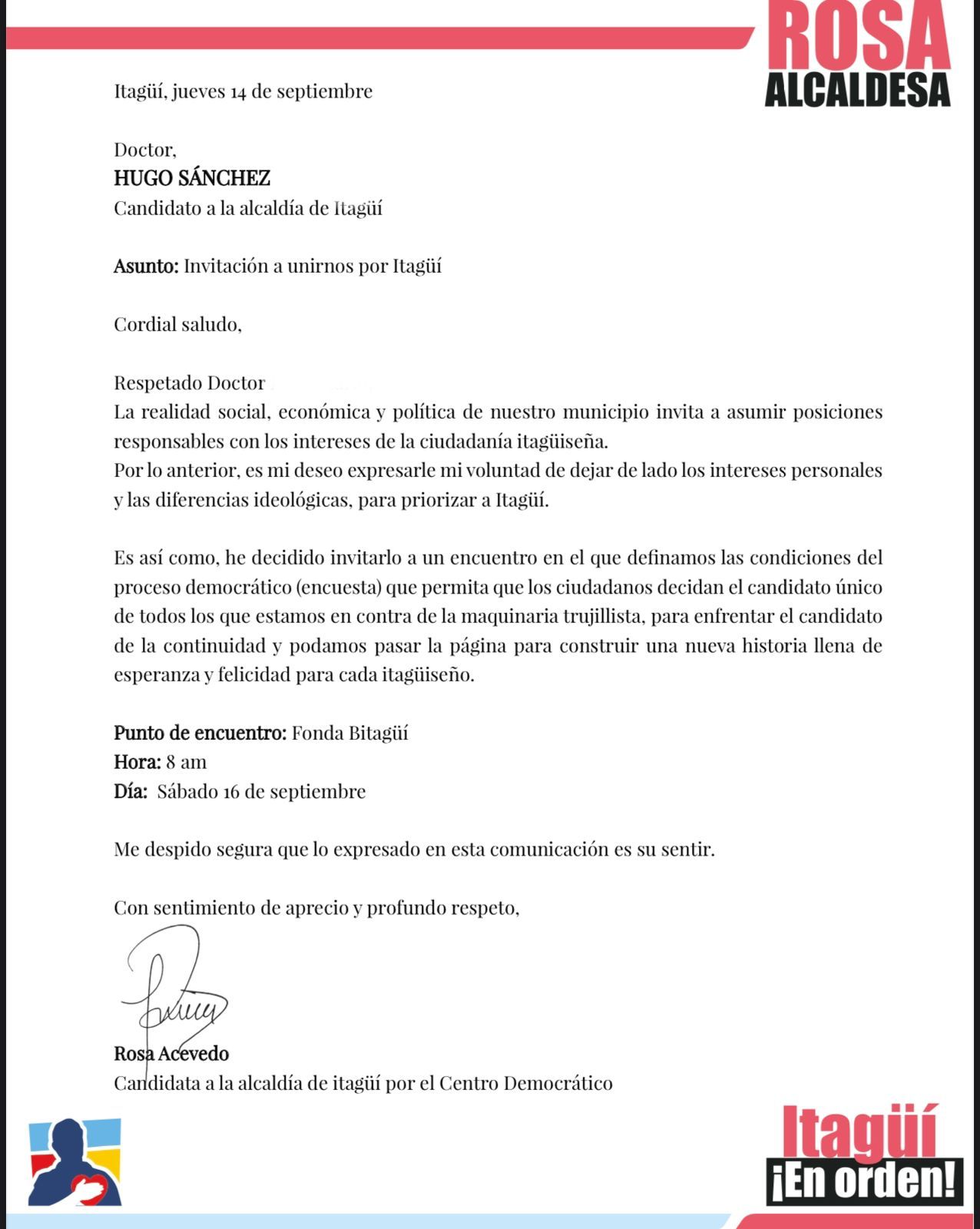 A través de un video publicado en sus redes sociales, la candidata del Centro Democrático a la Alcaldía en Itagüí, Rosa Acevedo, informó que envió una carta a los aspirantes que no pertenecen al continuismo, para unirse.