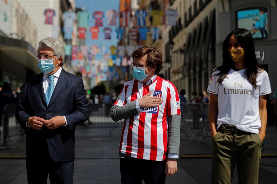 El alcalde, los representantes de ambos clubes, el presidente de LaLiga, Javier Tebas, y la vicealcaldesa Begoña Villacís presentaron este miércoles una campaña de apoyo a los comercios y la hostelería de la capital, en la comercial calle de Preciados, decorada con camisetas de los clubes de LaLiga Santander con motivo de la vuelta de la competición, que arrancará este miércoles en Vallecas con la disputa del Rayo Vallecano-Albacete que estaba aplazado.