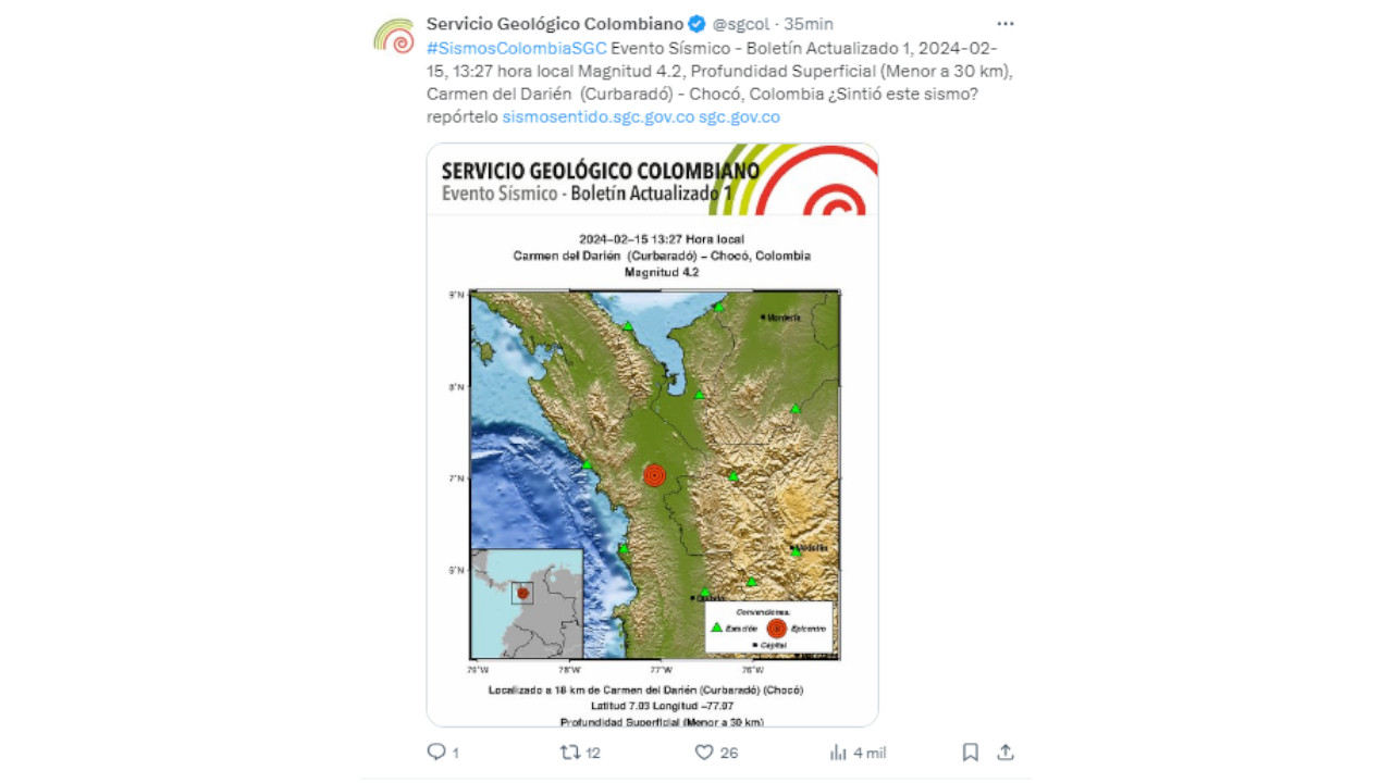 De acuerdo con el Servicio Geológico Colombiano, el temblor ocurrió a las a la 1:27 (hora local) con magnitud 4.2, profundidad Superficial (Menor a 30 km) en el municipio de Carmen del Darién.