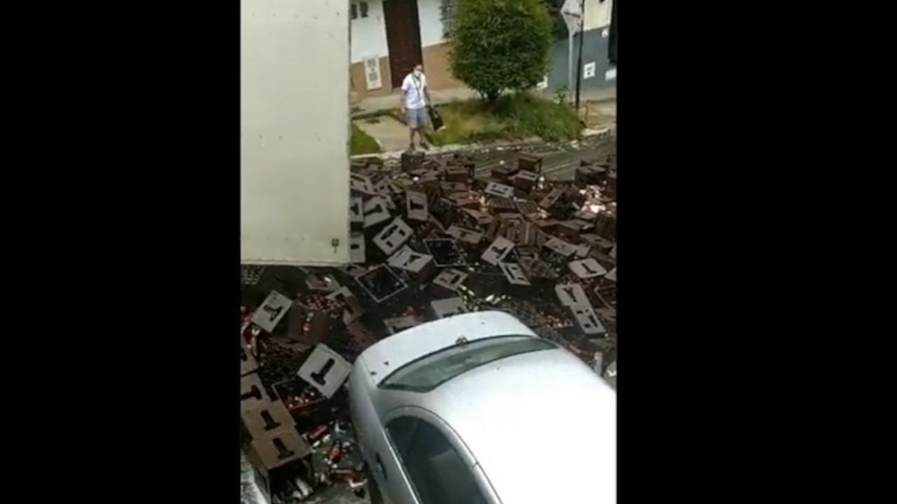 En redes sociales fue difundido un video en el que se logra observar el momento en el que están todas las cajas de cerveza tiradas sobre el asfalto y varias de las botellas ya quebradas, con el producto desparramado en medio de la vía.