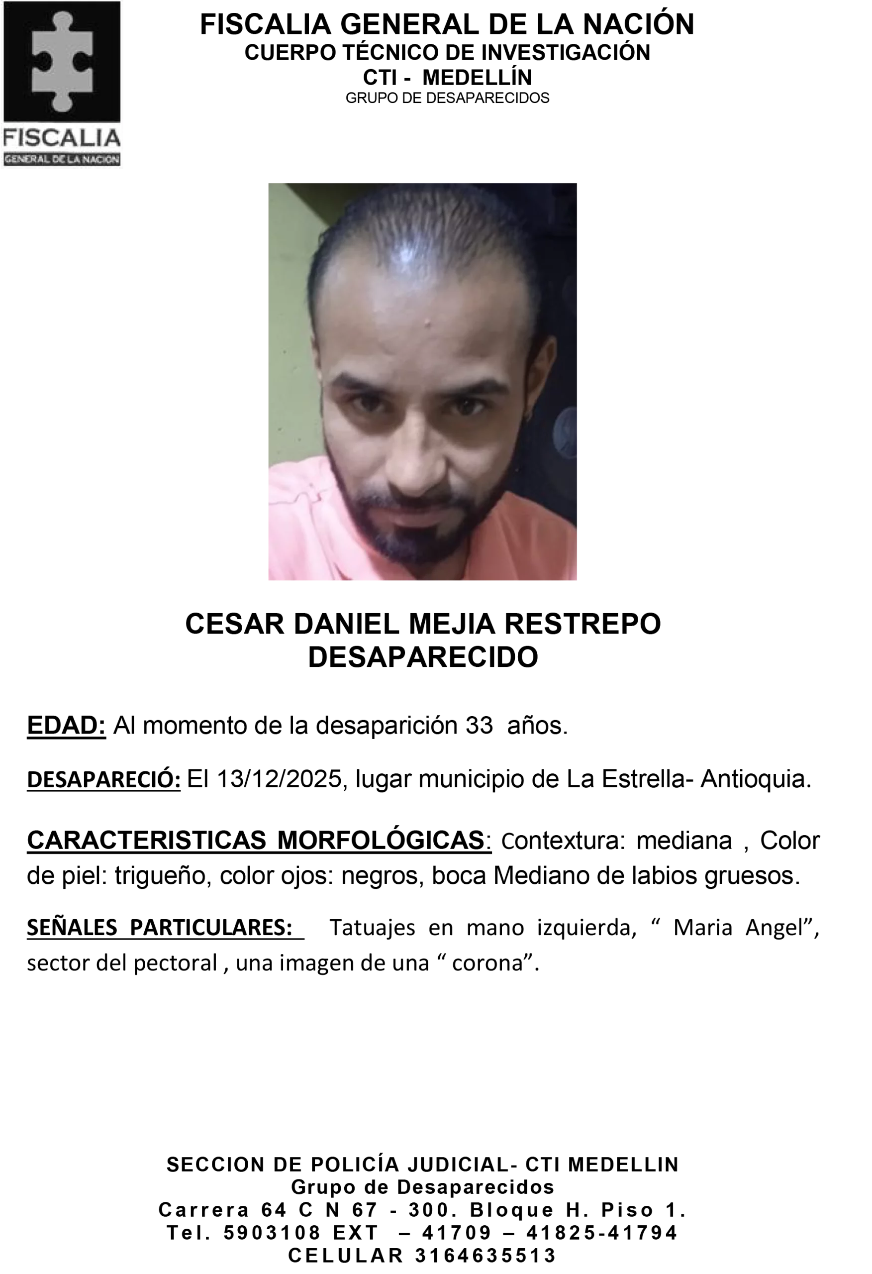 Resumen: César Daniel Mejía Restrepo se encuentra desaparecido desde el 13 de diciembre de 2025.