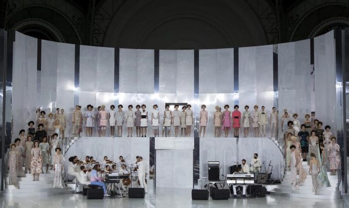 Como es habitual en los desfiles de Chanel, la instalación fue espectacular. En esta ocasión, una plataforma circular fue girando hasta descubrir a una orquesta de cuerdas y percusión que amenizó el espectáculo con música en directo.