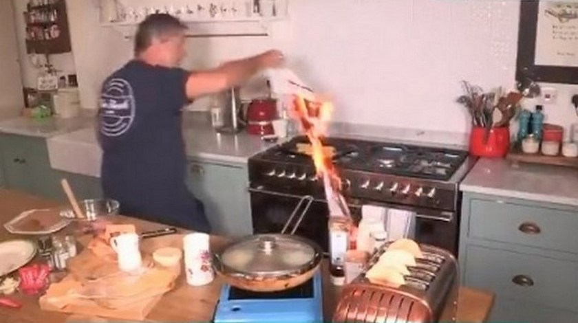 En plena transmisión en vivo del programa ‘This morning’ uno de los cocineros casi provoca un incendio por un descuido, John Torode fue el encargado de hacer la preparación en su casa y casi quema la cocina luego de que se le prendiera un trapo.