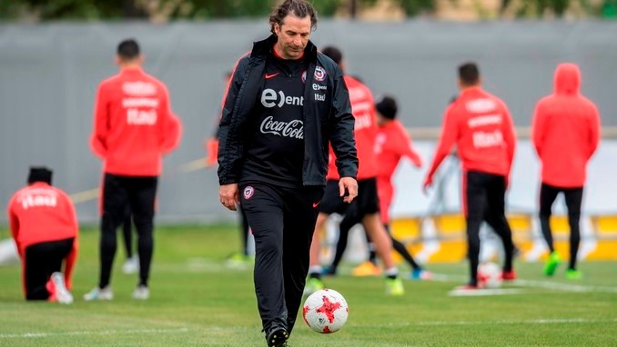 El seleccionador chileno, el hispano-argentino Juan Antonio Pizzi, lidera una sesión de entrenamientos en San Petersburgo, Rusia. EFE