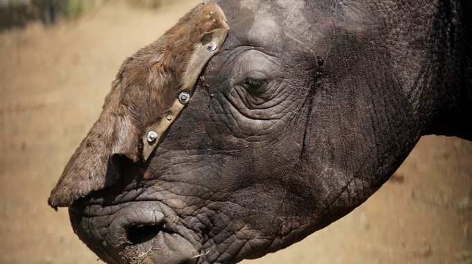 Un rinoceronte blanco de tres años recibe atención médica tras ser atacado por cazadores furtivos que le arrancaron su cuerno.