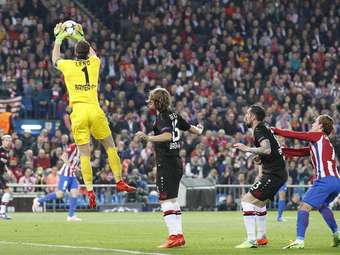 El portero del Bayer Leverkusen Bernd Leno (i) para el balón ante sus compañeros de equipo durante el partido de vuelta de octavos de final de la Liga de Campeones que se juega esta noche en el estadio Vicente Calderón, en Madrid. EFE/Zipi
