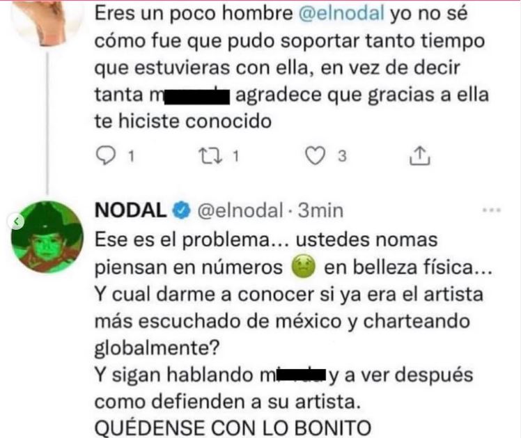 Twitter se encendió con la discusión entre el mexicano y los fanáticos de su ex. Un usuario afirmó que se había hecho conocido gracias a Belinda, a lo que Nodal respondió: “Cuál darme a conocer si ya era el artista más escuchado de México y charteado globalmente”.