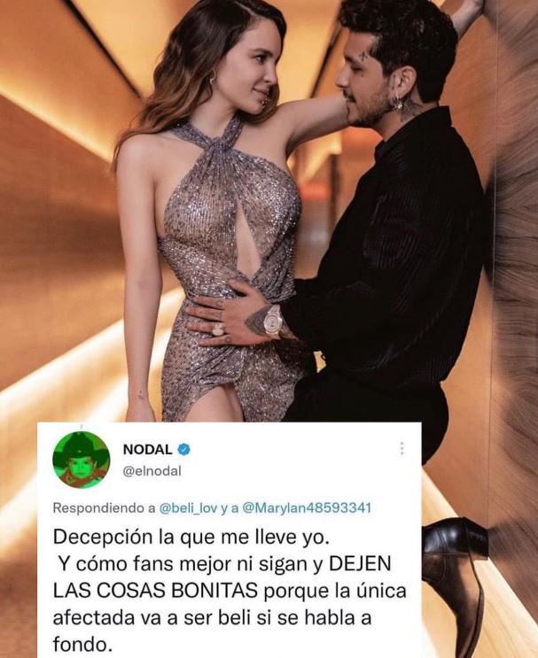 La reacción más polémica de Christian Nodal vino cuando le escribieron “Qué decepción tan grande nos acabas de dar a todos los que te apoyamos en su momento”. Su respuesta dejó entrever que Belinda lo había decepcionado a él y no al contrario. “Decepción la que me llevé yo. Y como fans, mejor ni sigan y DEJEN LAS COSAS BONITAS porque la única afectada va a ser Beli, si se habla a fondo”, escribió.