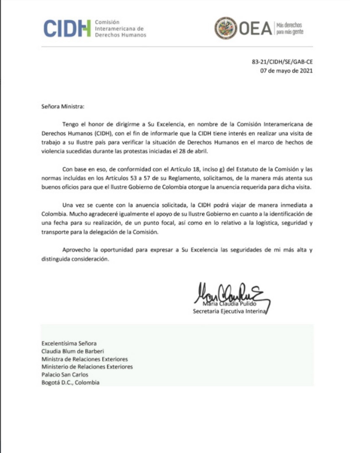 A través de un comunicado publicado en Twitter, la Comisión Interamericana de Derechos Humanos – CIDH- pidió visitar a Colombia tras denuncias sobre violaciones a los derechos humanos durante las manifestaciones que se vienen presentado desde el 28 de abril.