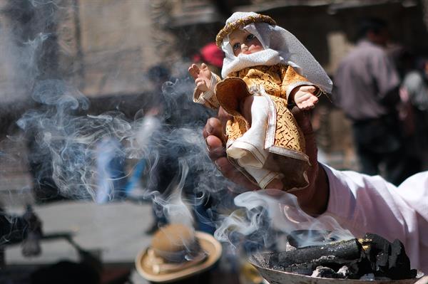 Juana Quispe Nina, es una mujer amauta, que aplica el sahumerio a las estatuillas del Niño de Jesús de la gente que se lo pide, relató a EFE.