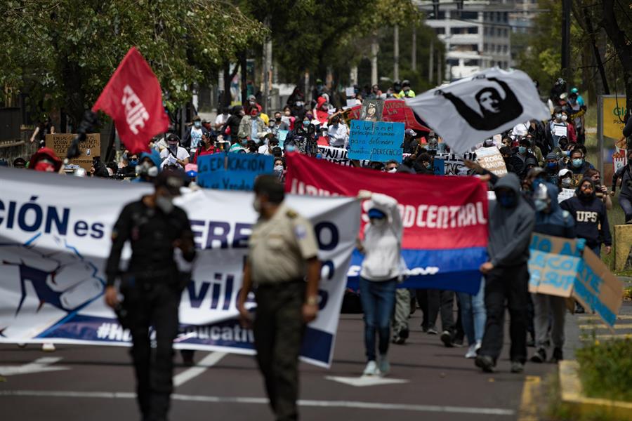 Como ya lo hicieran la semana pasada, los estudiantes, ataviados con mascarillas y guardando el distanciamiento físico entre ellos, se congregaron en las inmediaciones de la Universidad Central (Estatal) de Quito para rechazar los ajustes impuestos por el Gobierno a la educación.