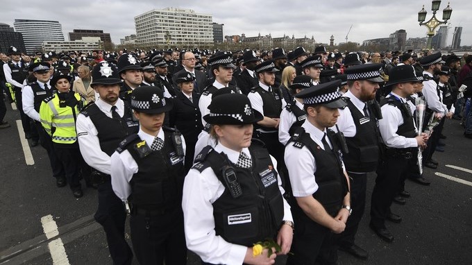 Agentes de policía, que perdieron a su compañero Keith Palmer el pasado miércoles, se dieron la mano con miembros de la asociación juvenil musulmana “Ahmadiyya”, que portaban camisetas en las que podía leerse “Soy musulmán, puedes preguntarme lo que quieras”.