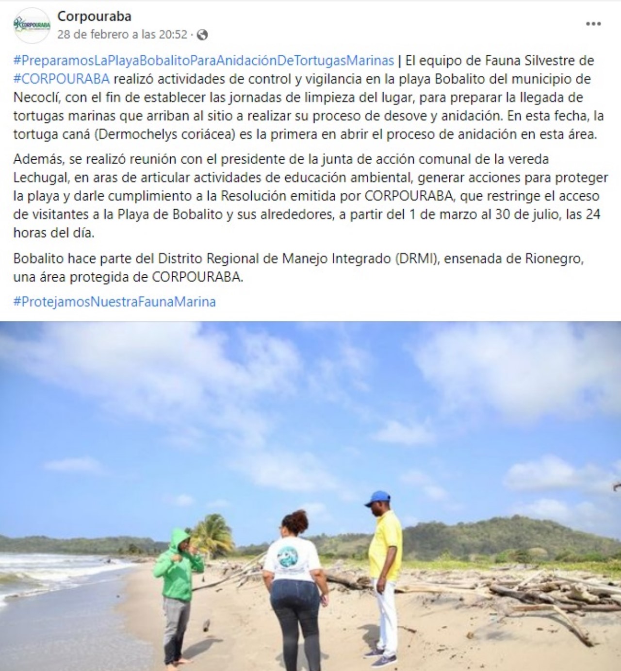 “El equipo de Fauna Silvestre realizó actividades de control y vigilancia en la playa Bobalito del municipio de Necoclí, con el fin de establecer las jornadas de limpieza del lugar, para preparar la llegada de tortugas marinas que arriban al sitio a realizar su proceso de desove y anidación”, anunciaron en las redes sociales Corpourabá.
