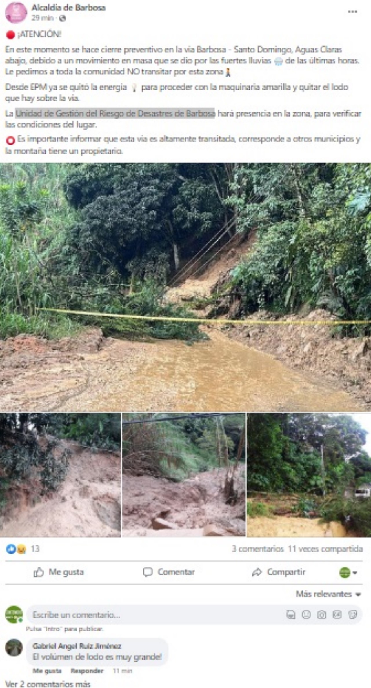 La Alcaldía del municipio de Barbosa informó por medio de sus redes sociales que la gran cantidad de lodo que hay en el sector se dio a un movimiento en masa por las fuertes lluvias.