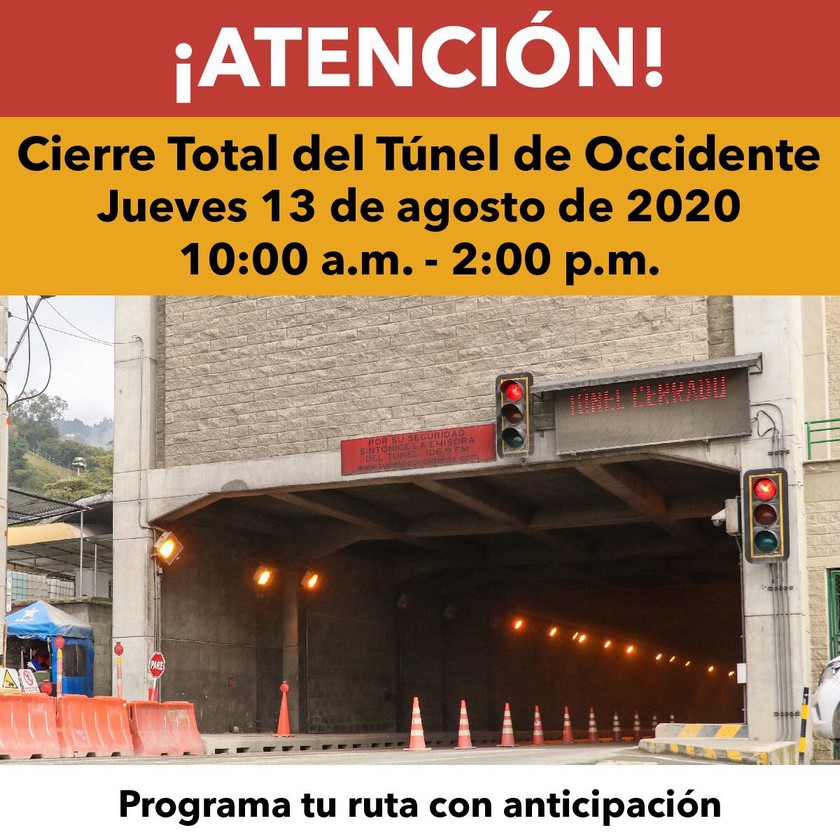 La Agencia Nacional de Infraestructura, ANI, informó que este jueves 13 de agosto habrá cierre del Túnel de Occidente entre las 10 de la mañana y las 2 de la tarde.