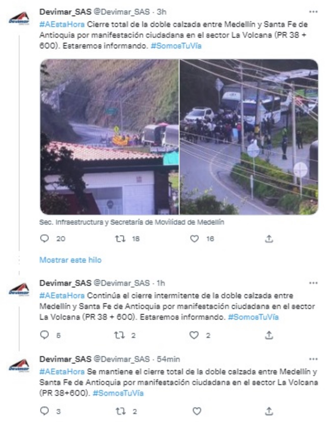 De acuerdo con la Concesionaria Desarrollo Vial al Mar (Devimar) “Se mantiene el cierre total de la doble calzada entre Medellín y Santa Fe de Antioquia por manifestación ciudadana en el sector La Volcana (PR 38+600)”.