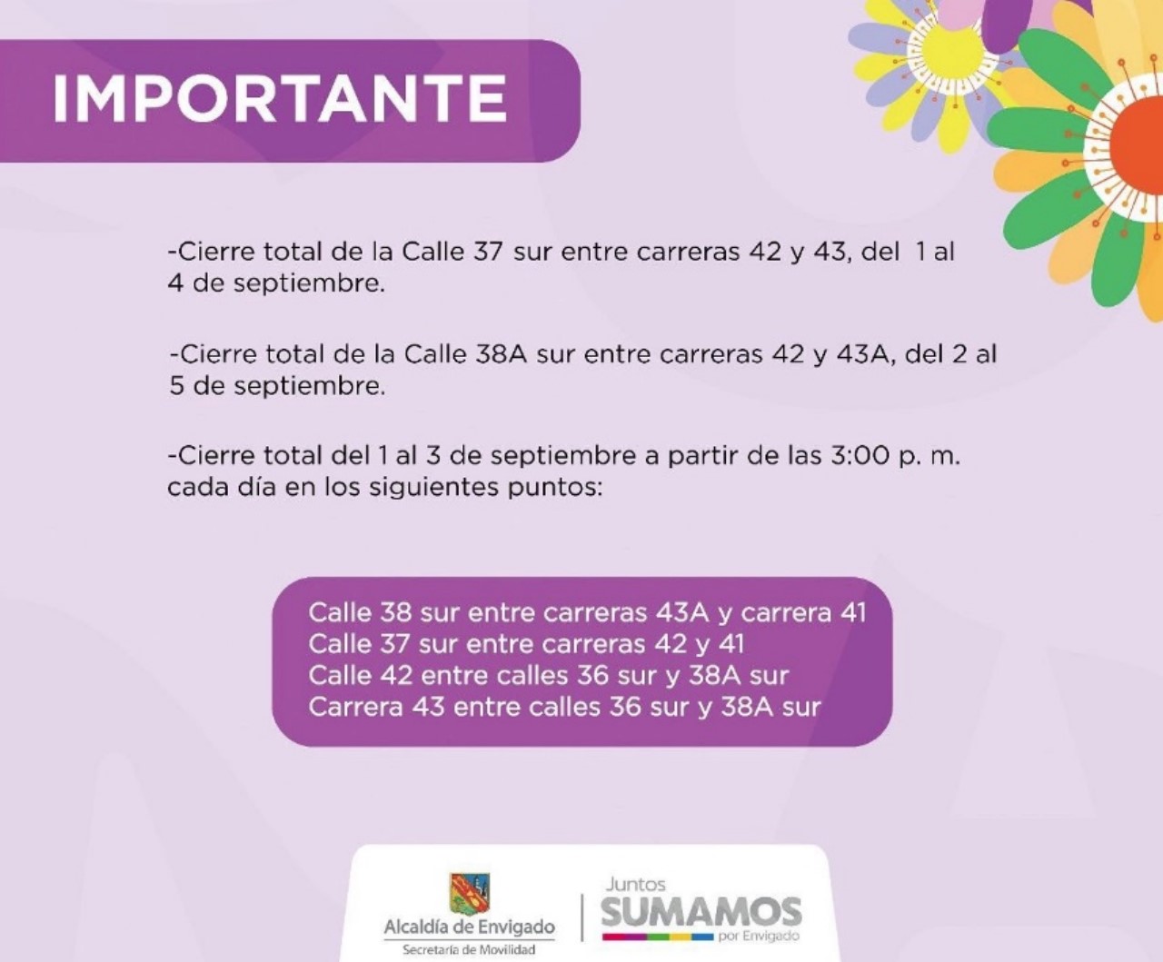El cierre de la calle 37 sur, entre carreras 42 y 43A, se realizará entre el jueves 1 y el domingo 4 de septiembre.
