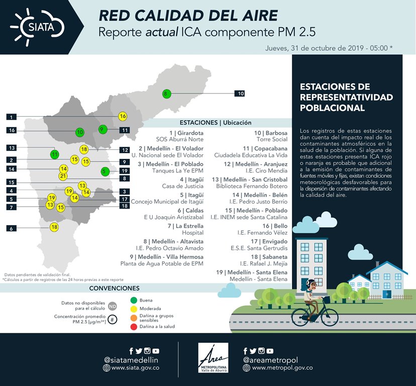 Bello, Copacabana, Barbosa, San Cristóbal y Santa Elena son las que mantienen buena calidad del aire. Estaciones como el Volador, Villa Hermosa, Itagüí y Caldas, correspondientes a Medellín y el sur del Valle de Aburrá, presentan condiciones meteorológicas desfavorables para la dispersión de contaminantes.
