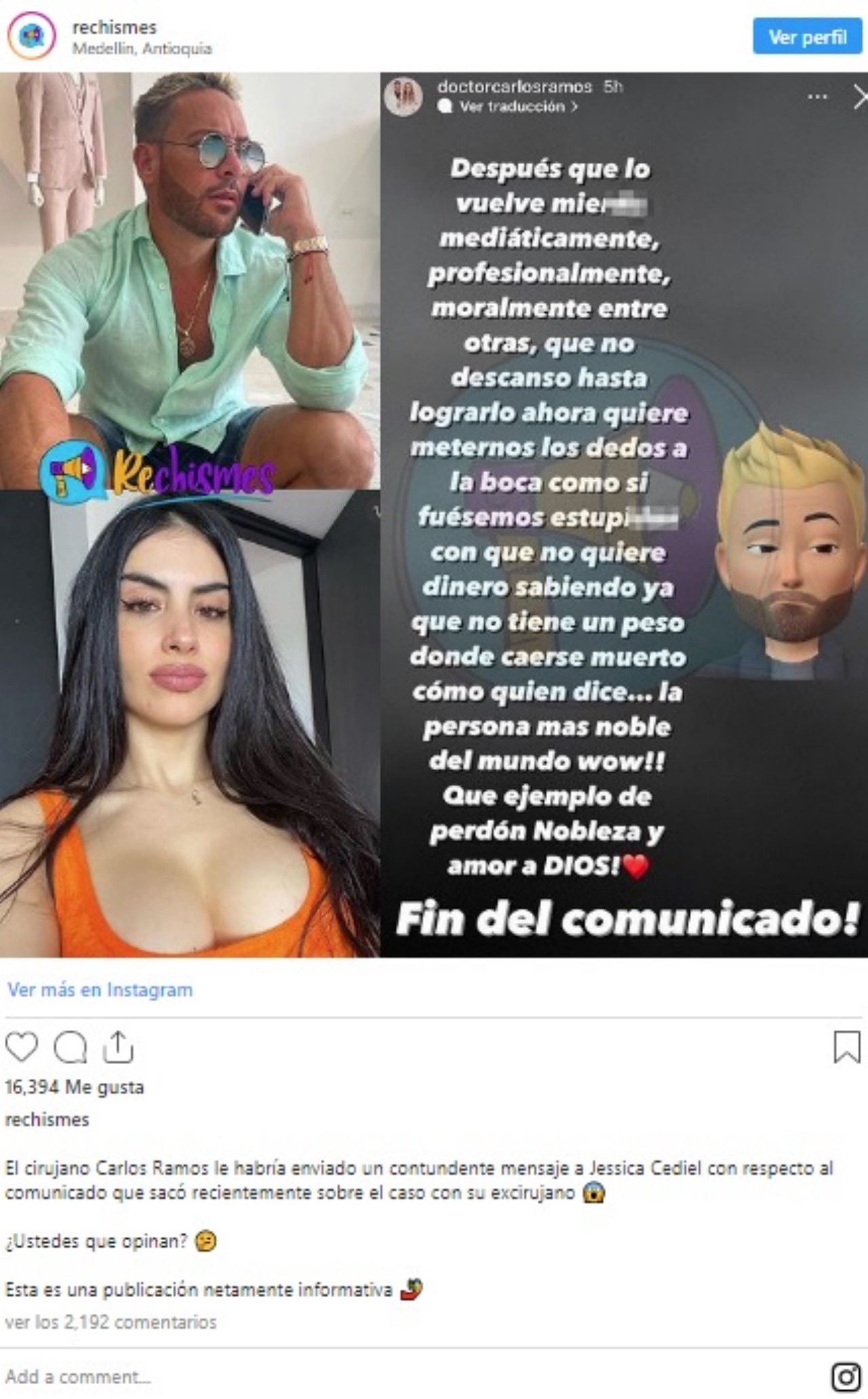 Ante las declaraciones de la presentadora, el cirujano Carlos Ramos le respondió por medio de sus estados de Instagram.