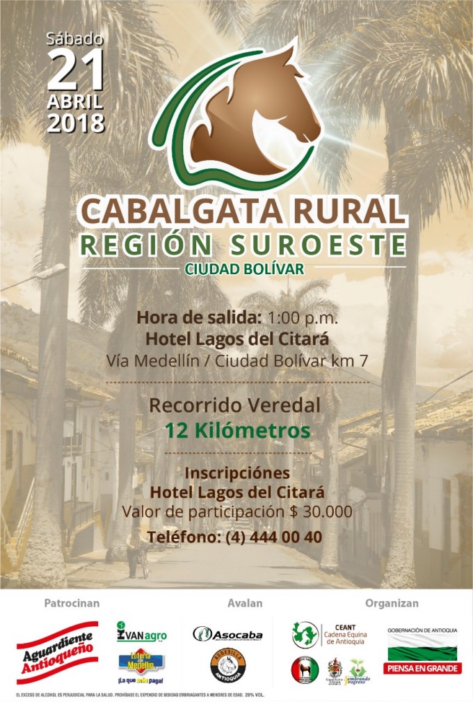 El municipio de Ciudad Bolívar vivirá la tercera versión de la Cabalgata Ecológica Subregional, organizada por la Cadena Equina de Antioquia (Ceant) y la Gobernación de Antioquia, a través de las Secretarías de Agricultura y Desarrollo Rural y de Productividad y Competitividad, con el apoyo de Asdesilla, IvanAgro, Asocaba, Lotería de Medellín, Fábrica de Licores de Antioquia, alcaldía de Ciudad Bolívar y las universidades con facultades de veterinaria, entre otros aliados.