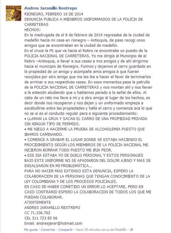 Según los hechos relatados por Andrés Jaramillo Restrepo, la madrugada del pasado 9 de febrero, se dirigía proveniente de Medellin hacia el municipio de El Retiro, en el cruce la FE, cuando se disponía a llevar unos amigos a su casa, fue detenido por una patrulla de la policía.