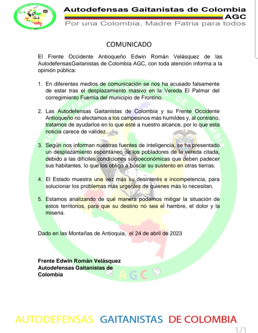 Ante este suceso, este 25 de abril, las Autodefensas Gaitanistas de Colombia o ‘Clan del Golfo’, emitieron un pronunciamiento en el que indican que ellos no tienen relación alguna con este hecho.