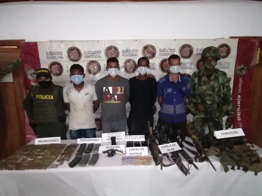 Los capturados llevaban en su poder cinco armas largas, un arma corta, cuatro proveedores, abundante munición de diferente calibre, una mina antipersona, tres celulares y dinero en efectivo, material que les fue incautado por tropas del Ejército.