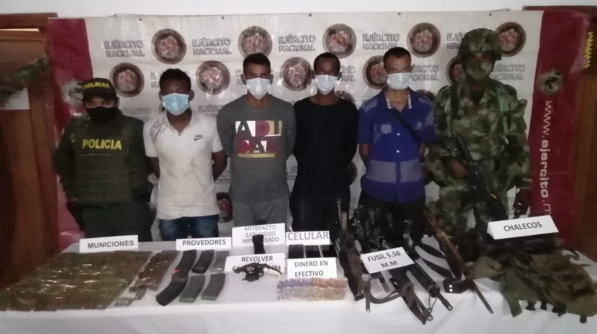Los capturados llevaban en su poder cinco armas largas, un arma corta, cuatro proveedores, abundante munición de diferente calibre, una mina antipersona, tres celulares y dinero en efectivo, material que les fue incautado por tropas del Ejército.