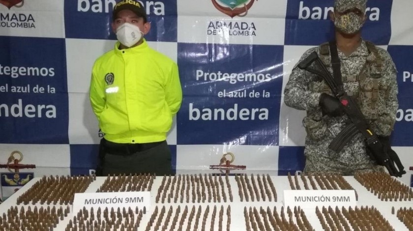La Armada con el apoyo de la Policía descubrió un depósito ilegal, ubicado en área general de Cerro Pelado, corregimiento de Don Gabriel, zona rural del municipio de Ovejas, en el que estaban almacenados 1.331 cartuchos calibre 9 MM, que al parecer pertenecerían al grupo ilegal Clan del Golfo.