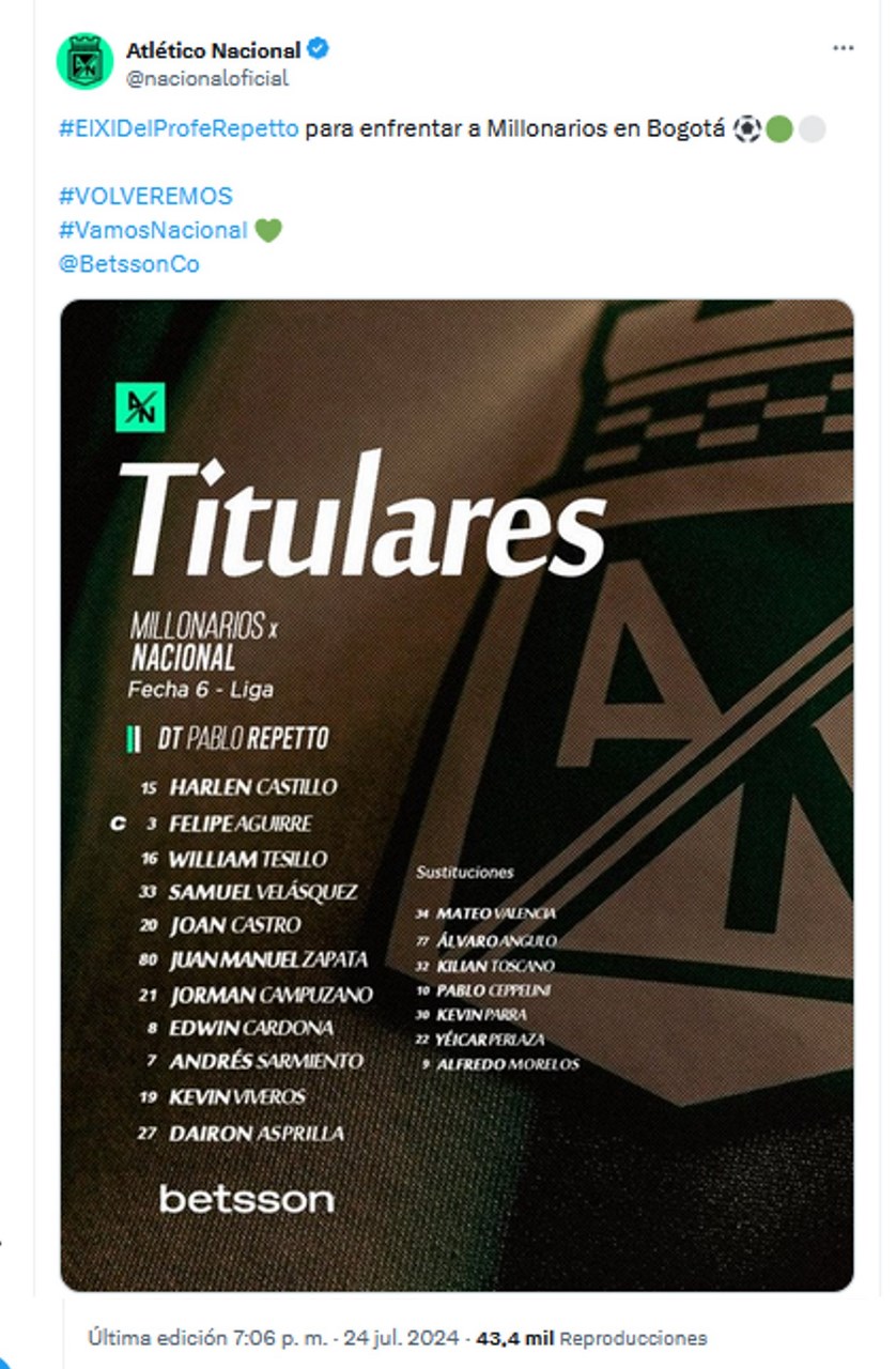 Resumen: ¡No te pierdas el clásico entre Atlético Nacional y Millonarios en El Campín! Repetto escoge a sus titulares para el partido adelantado de la Liga Beplay II 2024. ¡Vibrante encuentro desde las 8 de la noche!